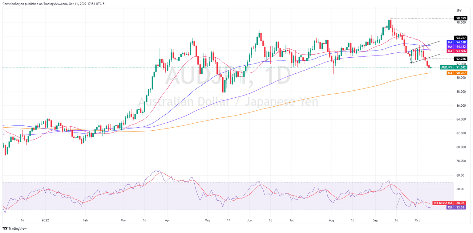 The AUD/JPY daily chart portrays the cross-currency as neutral-to-downward biased. The bearish-flag pattern broke to the downside as expected but fell short of reaching the 200-day EMA target of 90.70. Notably, the AUD/JPY was headed upwards, reaching 92.32, Tuesday’s high, in an upbeat mood, but BoE’s Bailey words turned sentiment sour. AUD/JPY key support levels lie at 91.00, followed by the 200-day EMA at 90.70, which, once cleared, could open the door towards a test of the 90.00 figure.