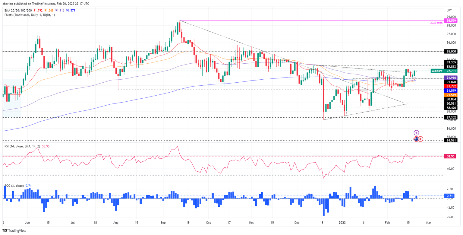- AUD/JPY clears a downslope resistance trendline around 92.50, with bulls eyeing 93.00.