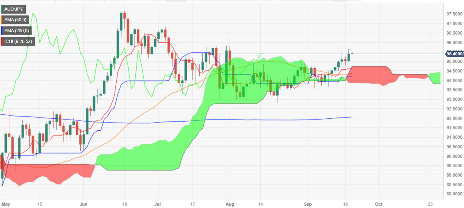 The AUD/JPY printed solid gains on Tuesday, and as Wednesday’s Asian session begins, the cross-currency pair hovers around 95.39 after touching a new one-and-a-half-month high at 95.64.