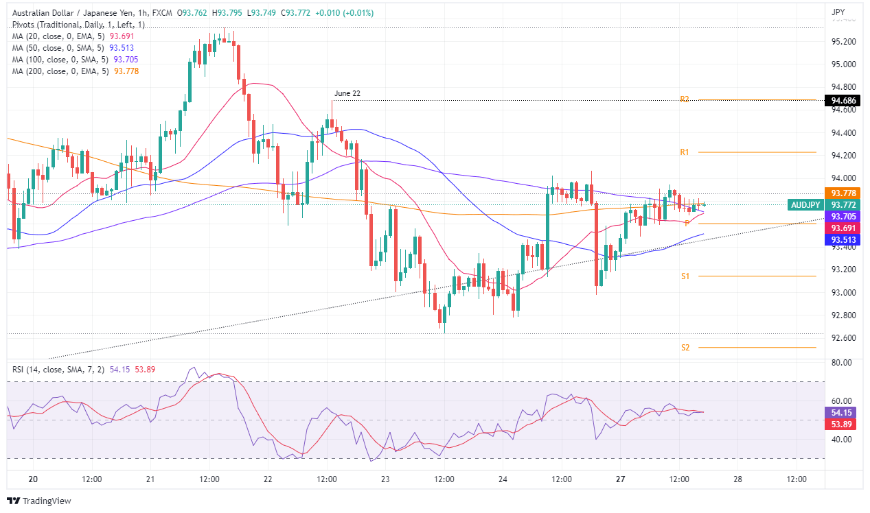 The AUD/JPY hourly chart illustrates the pair is consolidating but slightly moving to the upside, though at the time of writing, AUD/JPY buyers unable to break above the 200-EMA at 93.77 will leave the pair vulnerable to selling pressure. If that scenario plays out, the AUD/JPY first support would be the daily pivot at 93.60. Break below will expose the 50-EMA at 93.49, followed by the S1 pivot at 93.20.