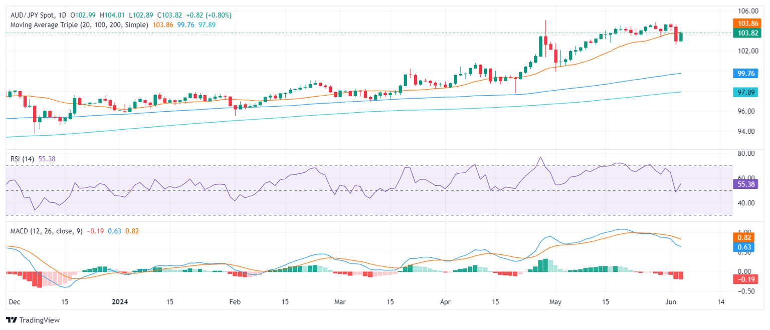 In Wednesday's trading session, the AUD/JPY pair bounced to 103.80, reflective of a resurgence in upward momentum. However, the buyers met resistance at the 20-day Simple Moving Average (SMA) and retreated.
