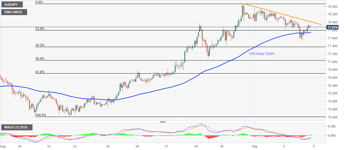 - AUD/JPY fades recovery moves from 100-hour EMA below 78.00.