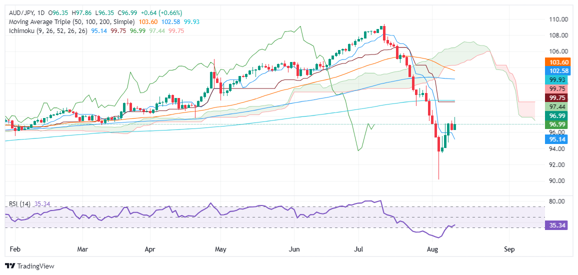 AUD/JPY Price Forecast: Clings to gains below 97.00 as downtrend remains