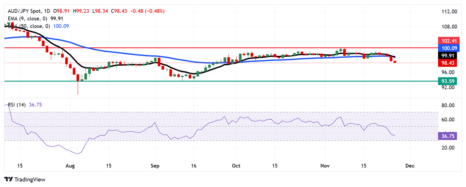 To the upside, the AUD/JPY cross may test the primary resistance around the nine-day EMA at 99.92 level, followed by the 50-day EMA at 100.09 level. A break above these levels could weaken the bearish bias, potentially pushing the currency cross toward the four-month high of 102.41, reached on November 7.