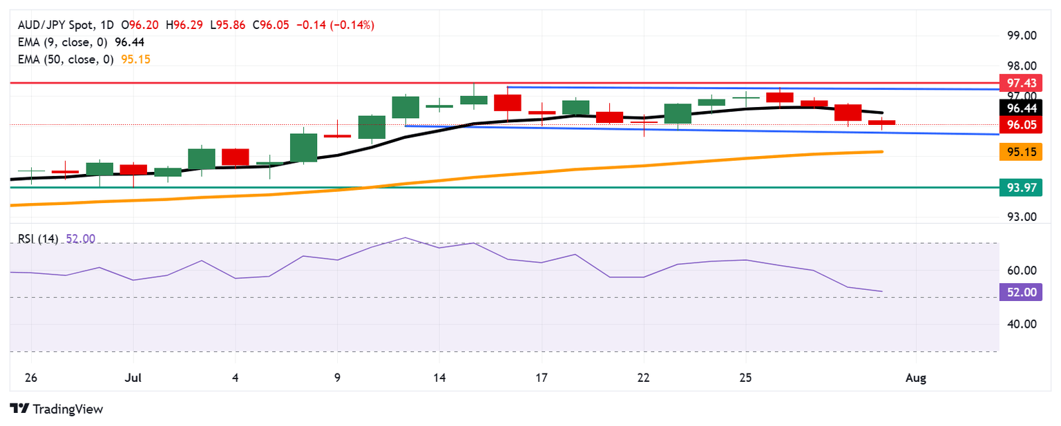 - AUD/JPY may find primary resistance at the nine-day EMA at 96.44.