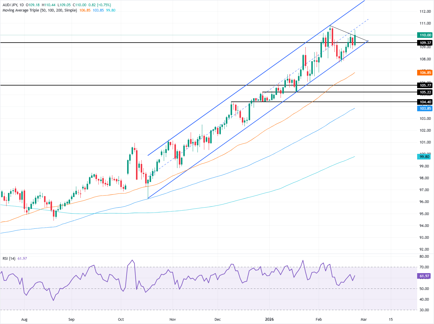 For a bullish continuation, buyers need to conquer 110.00, followed by the year-to-date (YTD) high at 110.67. A breach of the latter will expose 111.00. On the downside, the first key support would be the 20-day Simple Moving Average (SMA) at 109.10. on further weakness, the next stop would be a key support trendline drawn from November 2025 lows, at around 108.00.