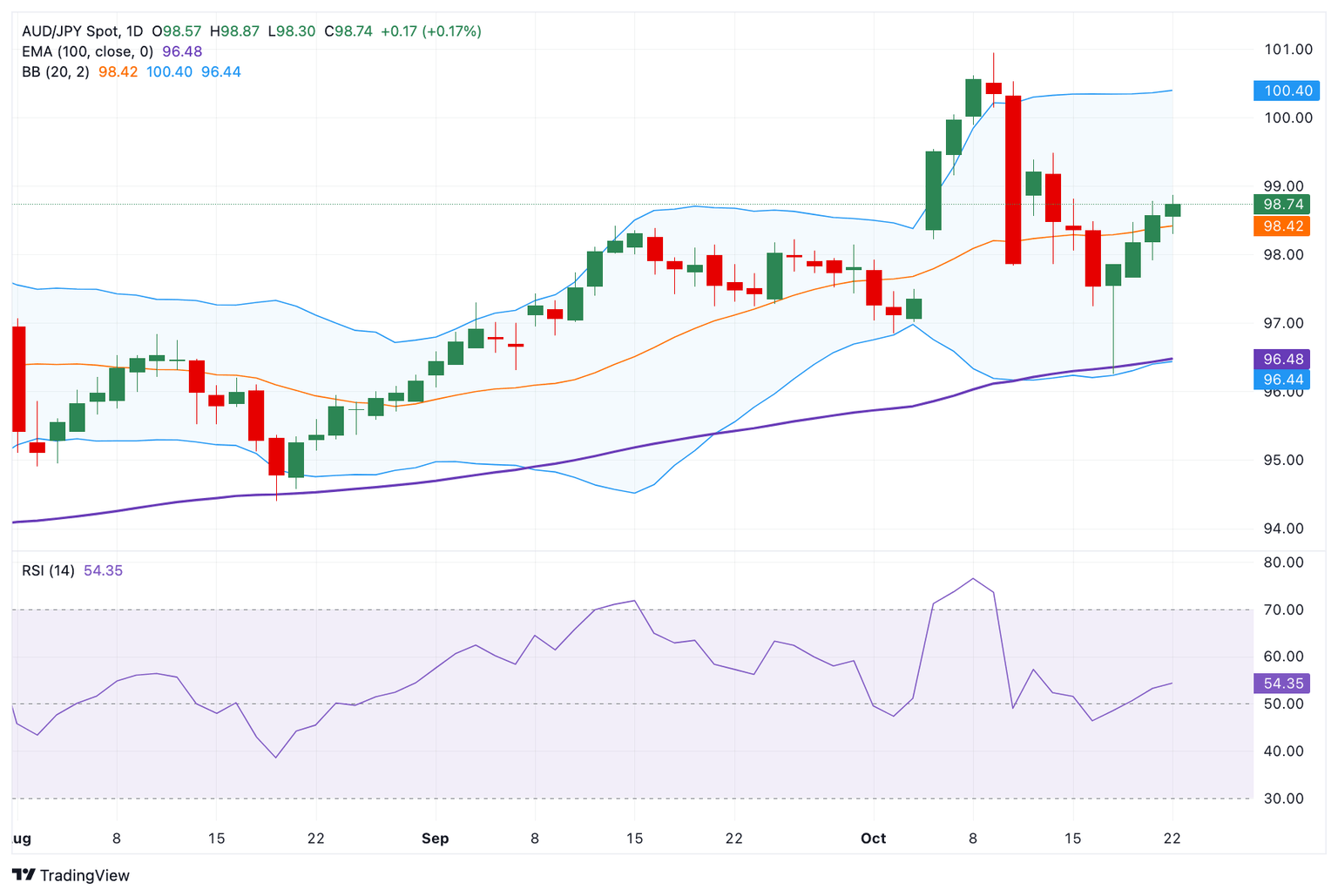The AUD/JPY cross extends its upside to around 98.80 during the early European session on Wednesday. The Japanese Yen (JPY) softens against the Australian Dollar (AUD) as conservative Sanae Takaichi was elected as Japan's Prime Minister, with traders betting her government could muddy the interest rate outlook and bring about a greater fiscal largesse.