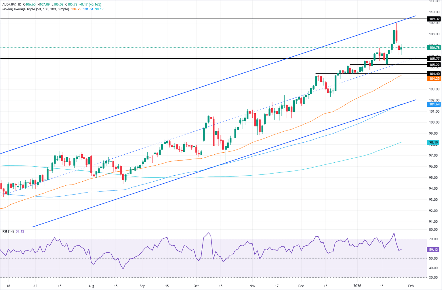 For a bullish continuation, the AUD/JPY must clear the January 26 high of 107.59. Once surpassed, the next stop would be 108.00 and 109.00, the yearly high.