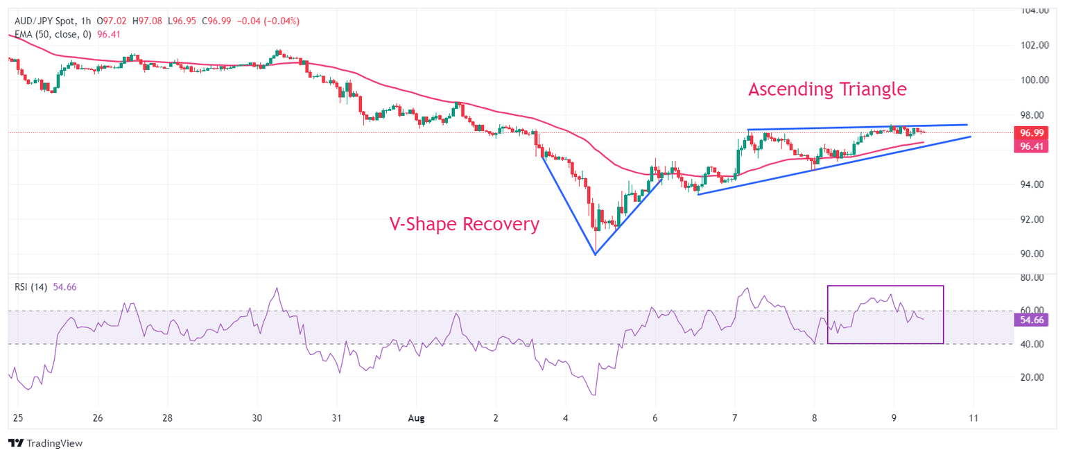 AUD/JPY oscillates in an Ascending Triangle chart pattern on an hourly timeframe, which exhibits a sharp volatility contraction. The 50-hour Exponential Moving Average (EMA) near 96.40 continues to provide support to the Australian Dollar bulls. Earlier, the asset delivered a V-shape recovery after posting a fresh annual low near 90.00.