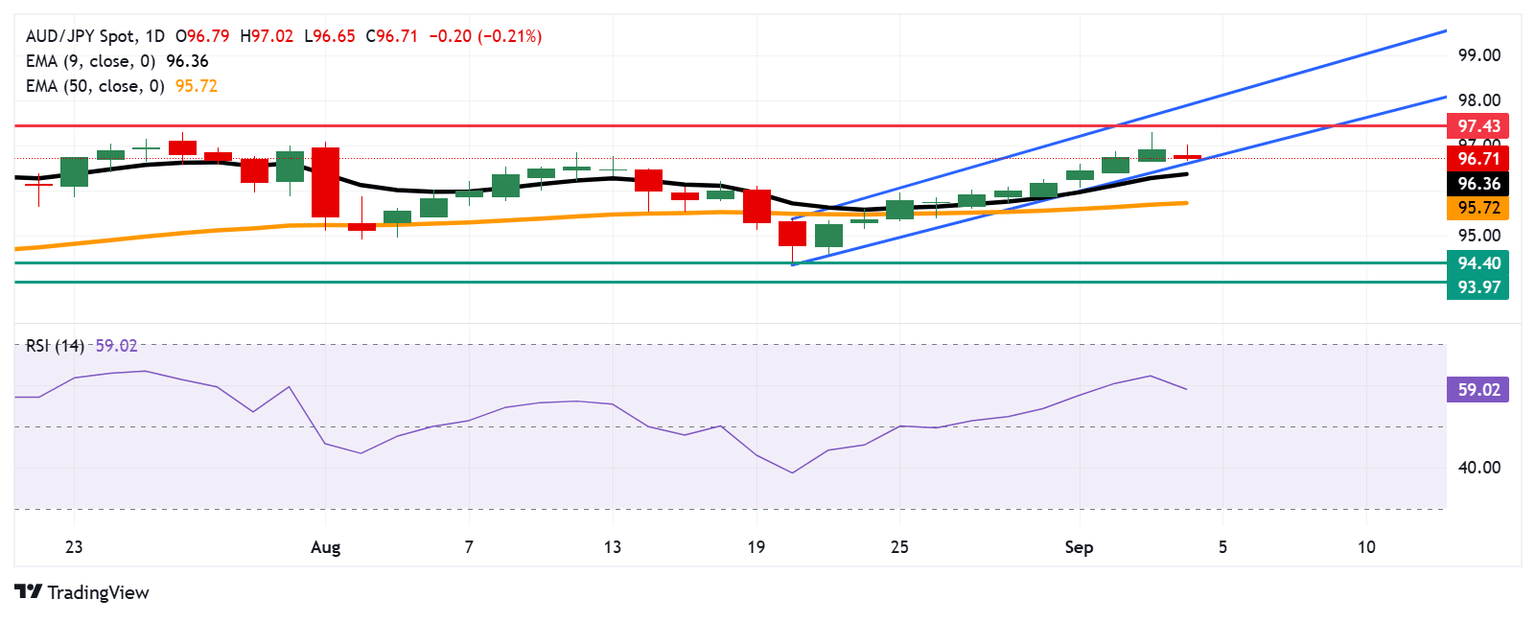 AUD/JPY Price Forecast: Tests confluence support zone near 96.50, nine-day EMA