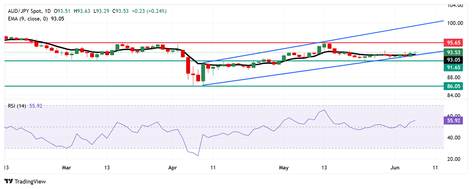 AUD/JPY extends its gains for the second successive session, trading around 93.60 during early European hours on Friday. A technical analysis of the daily chart shows that the currency cross remains within an ascending channel pattern, confirming a sustained bullish bias.