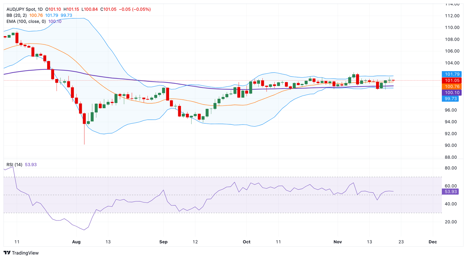 The upper boundary of the Bollinger Band near 101.80 acts as an immediate resistance level for AUD/JPY. Extended gains above this level could see a rally to 102.40, the high of November 7. The additional upside filter to watch is 103.36, the low of July 23.