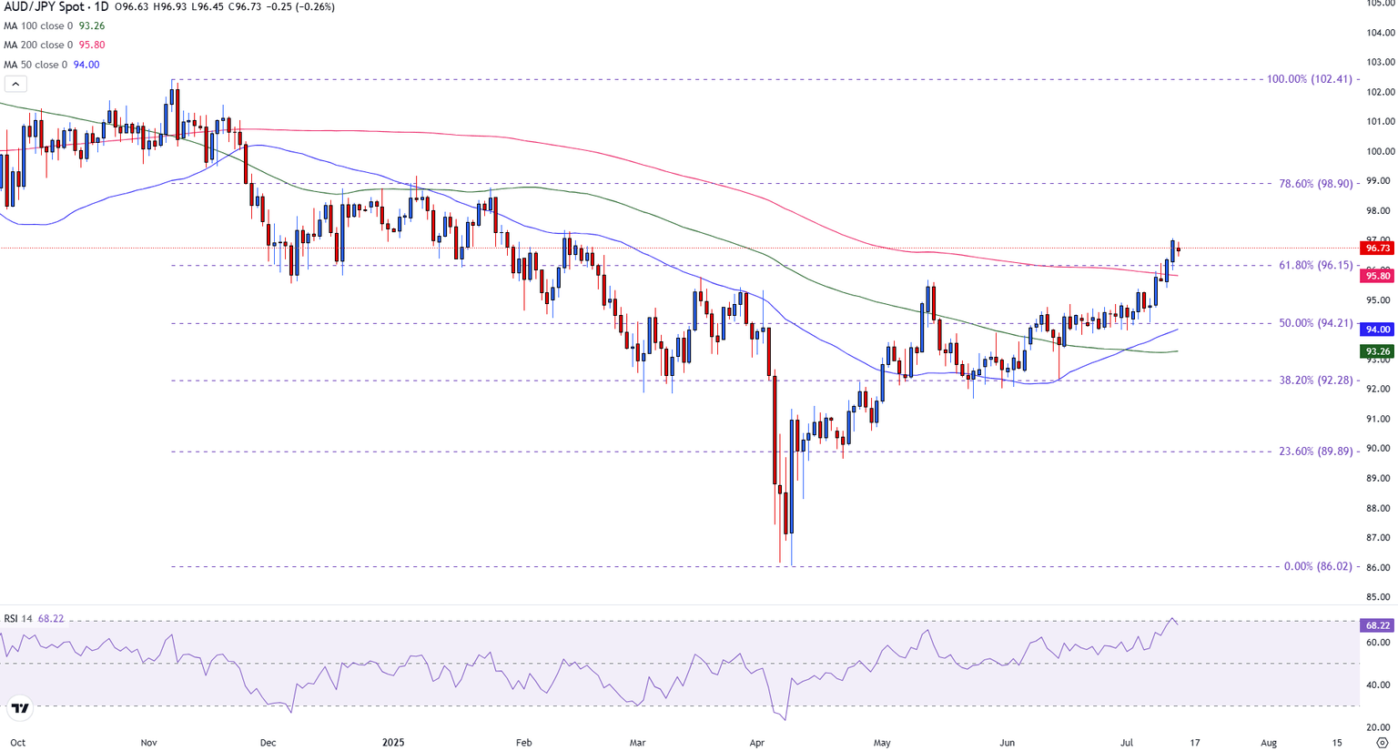 This potential reversal signal arises as the pair approaches a critical resistance zone. AUD/JPY has recently broken above the 61.8% Fibonacci retracement of the November 2024 to April 2025 decline, located at 96.15, a level considered technically significant.
