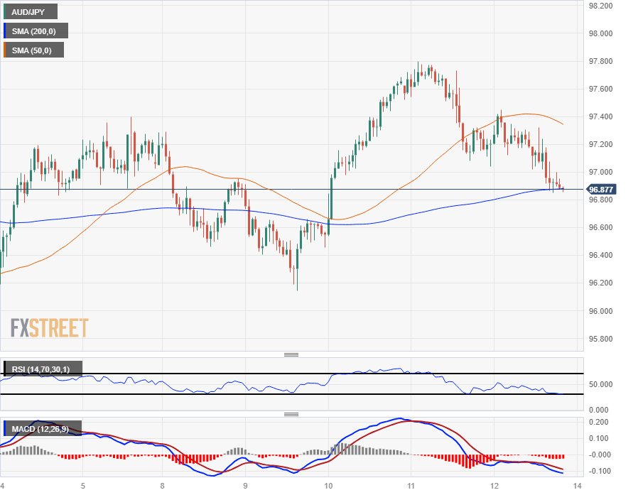 The Aussie’s dip against the Japanese Yen on Friday sends the AUD/JPY falling back into the 200-hour Simple Moving Average (SMA) near 96.90, and the pair is at risk of further entrenching into a medium-term consolidation pattern that has plagued the AUD/JPY since November.