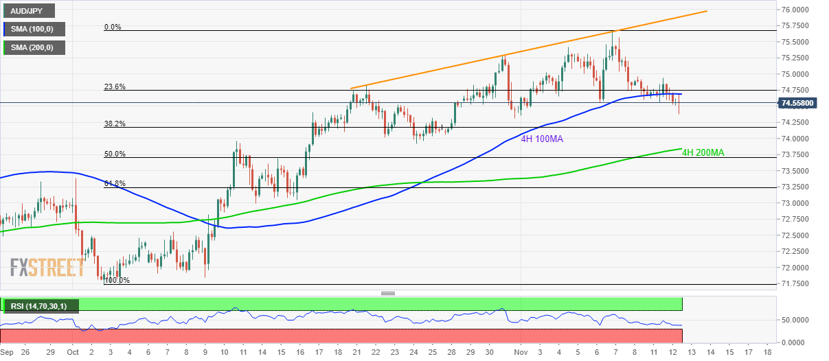Having slipped below 4H 100MA, AUD/JPY trades around the current month low, near 74.40, while heading into the European session on Wednesday.