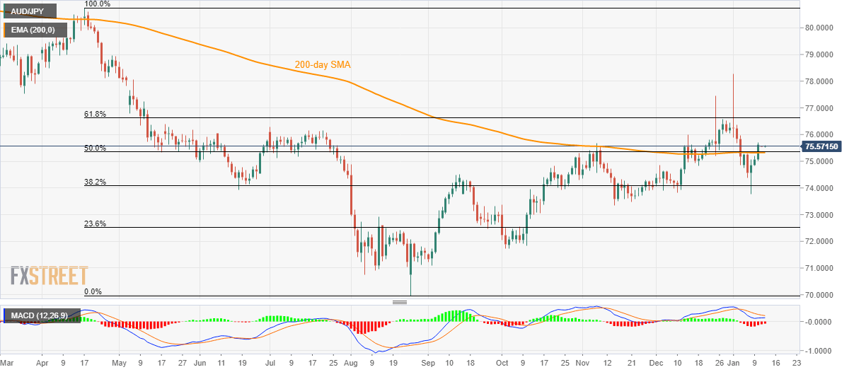 AUD/JPY awaits fresh direction as it trades near 75.57 during the initial Asian session on Monday. The pair recently recovered back beyond a confluence of 200-day EMA and 50% Fibonacci retracement of April-August 2019 fall. However, bearish MACD levels and nearness to the key upside resistances keep buyers in check.