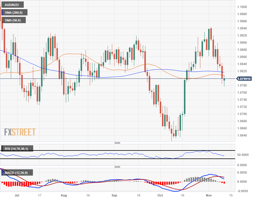 The Aussie-Kiwi pairing has tumbled back into the bearish side of the 200-day Simple Moving Average (SMA) and the 50-day SMA is cycling close by, adding technical resistance from Thursday's peak bids near 1.0810.