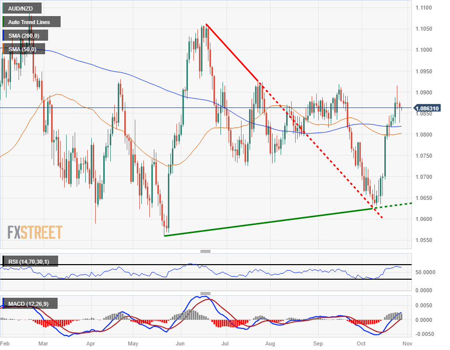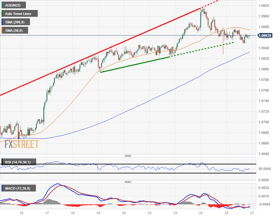 The AUD/NZD is trading into 1.0860 after Thursday's market session saw the pair pull back towards the 200-day Simple Moving Average (SMA), tipping into a daily low of 1.0828 as the recent bullish upswing runs out of momentum.