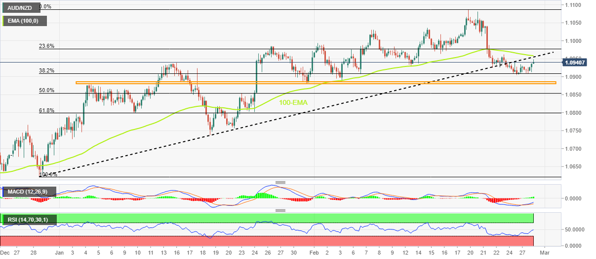 However, a convergence of the 100-bar Exponential Moving Average (EMA) and the previous resistance line from late December 2022, around 1.0960, appears the key hurdle for the AUD/NZD bulls to cross to convince the buyers.