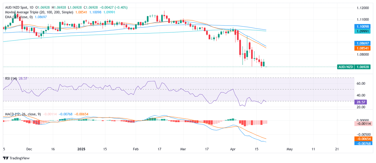 The AUD/NZD pair is exhibiting bearish signals, currently trading around 1.0700, down 0.40% today, and positioned mid-range between 1.06784 and 1.07439 during Monday’s session. The pair's inability to hold higher ground underlines the weight of selling pressure as the broader trend continues to favor the downside.