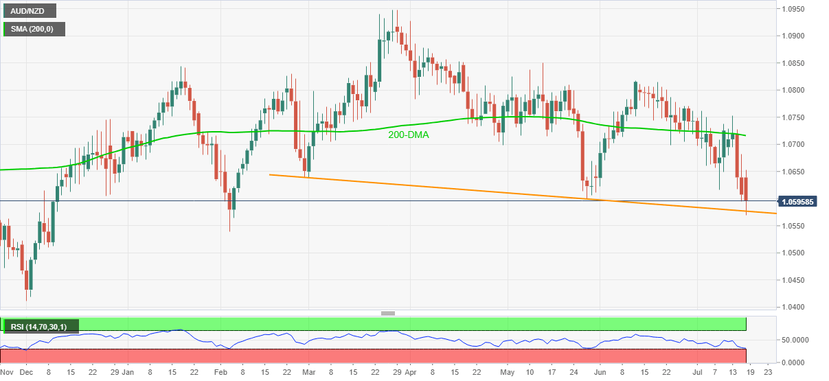 AUD/NZD remains on the back foot for the third consecutive day, after bouncing off February lows, down 0.25% intraday around 1.0595 during the early Asian session on Friday.