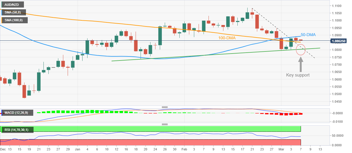 AUD/NZD Price Analysis: Depressed between 100-DMA and 50-DMA ahead of RBA