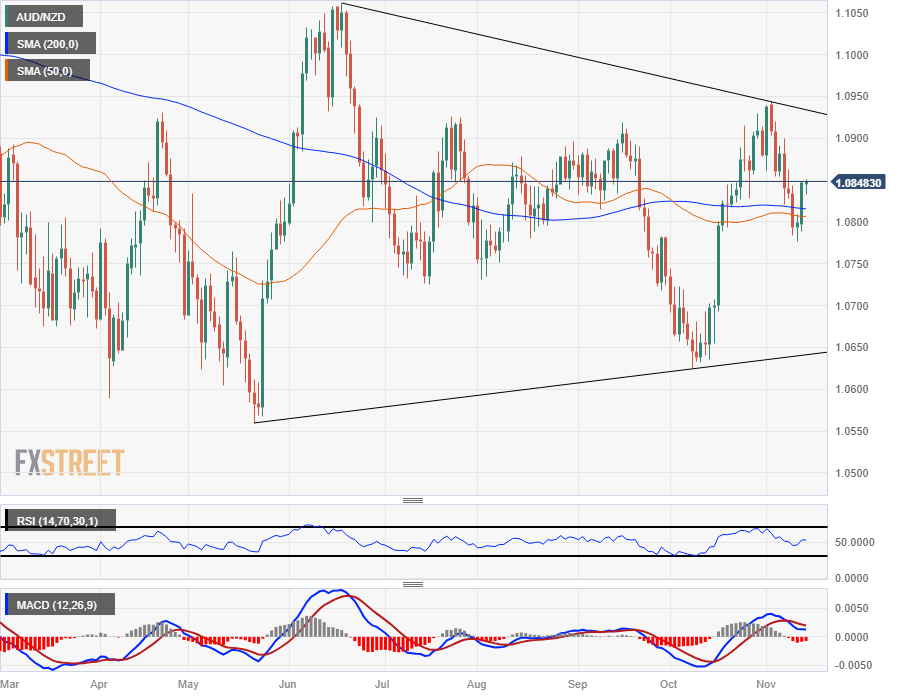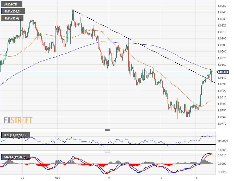 Hourly candles have the AUD/NZD running straight into the 200-hour Simple Moving Average (SMA) just south of 1.0860. The pair was constrained by the 50-hou SMA following early November's decline from 1.0900, and now the AUD/NZD finds itself trading into the top end of the constraining pattern between the two moving averages.