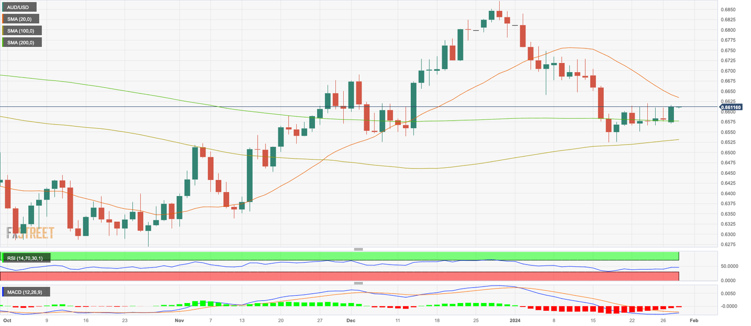 - AUD/USD trades at 0.6610 soaking in 0.50% gains, with bears struggling to seize control.