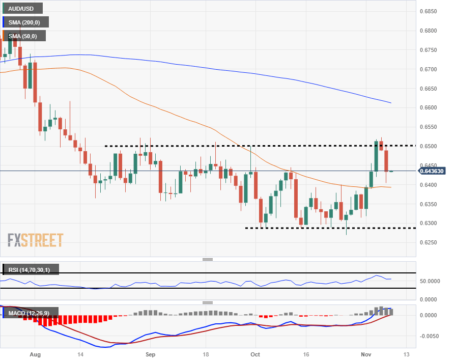 Tuesday's topside rejection following the dovish RBA showing is seeing the Aussie head back towards the 0.6400 handle, where the 50-day Simple Moving Average (SMA) currently sits, and bulls will be looking to springboard off the moving average in order to make a second bid for clearing technical resistance at the 0.6500 handle.