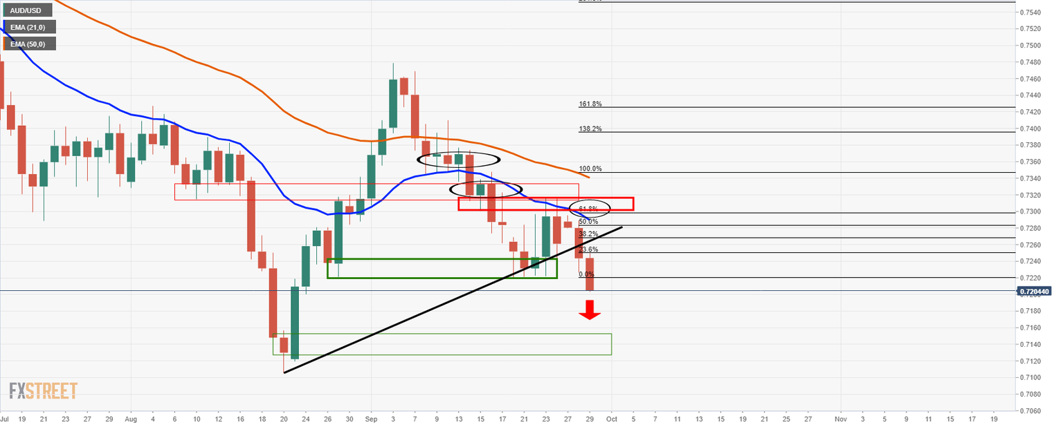 Meanwhile, in the US, traders are getting set for a reduction in the US Federal Reserve's asset purchases by the end of the year and an interest rate hike that could come as soon as late next year. This is adding fuel to the AUD/USD bear's fire. Markets are also concerned the Fed will start to withdraw policy support just as global growth slows and that is denting risk sentiment, for which AUD acts as a proxy. All in all, the outlook for the Aussie is bearish and the following technical analysis supports such an outlook.