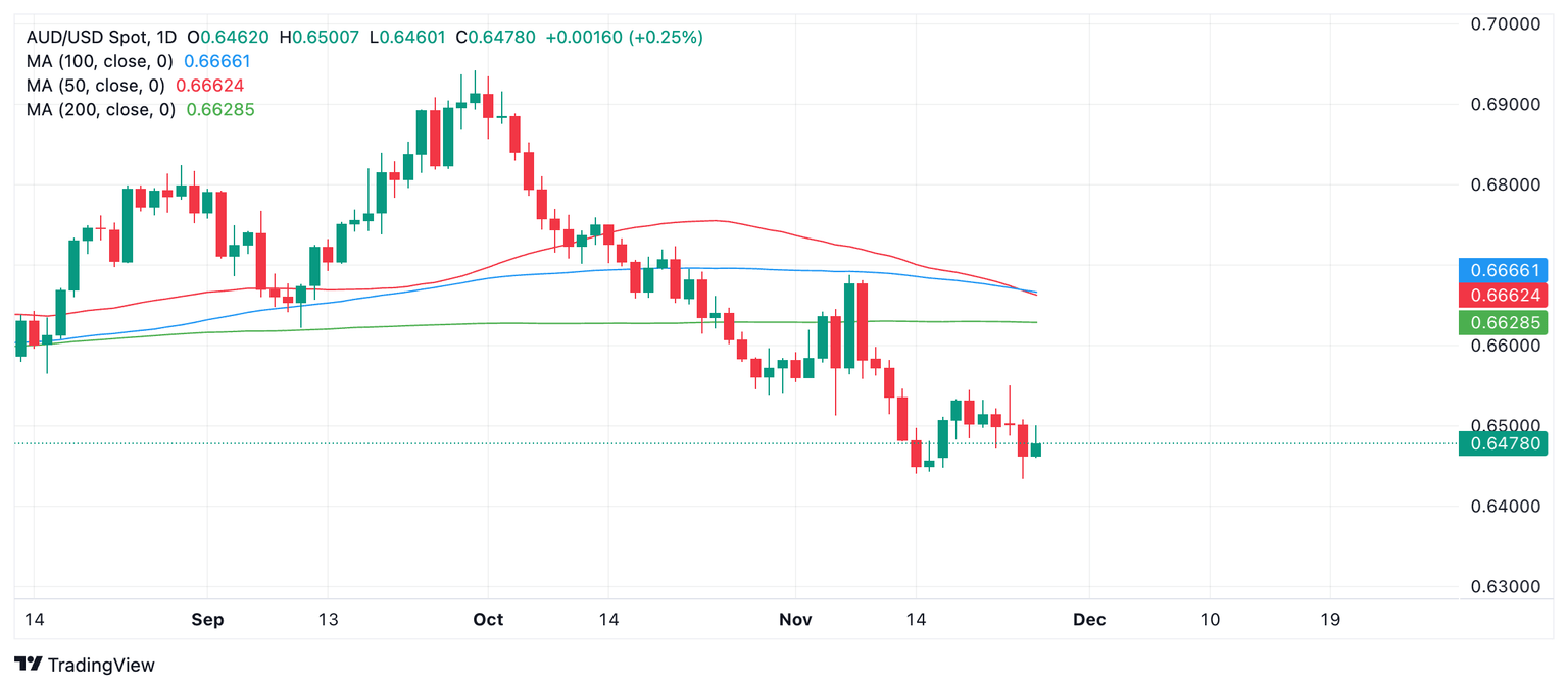 AUD/USD’s downtrend since the beginning of October has been due to a radical change in market expectations about the trajectory of interest rates in the US. Prior to October these had been for the Fed to lower interest rates aggressively but robust US economic data led to a revision of these expectations. The outcome of the US Presidential election was a further factor supporting the pair.