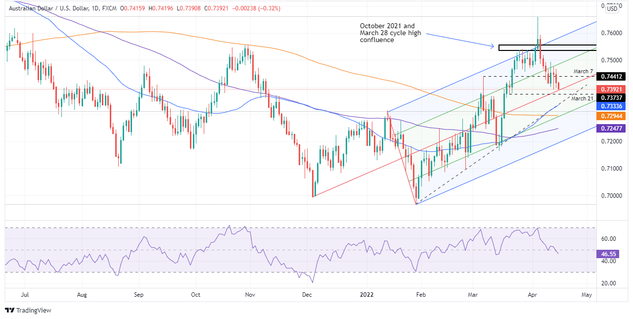 Upwards, the AUD/USD’s first resistance would be 0.7400. Once cleared, the next resistance would be the April 13 daily high at 0.7474, followed by 0.7500. A decisive break would send the AUD/USD towards the confluence of October 2021 and March 28 around the 0.7535-55 area.