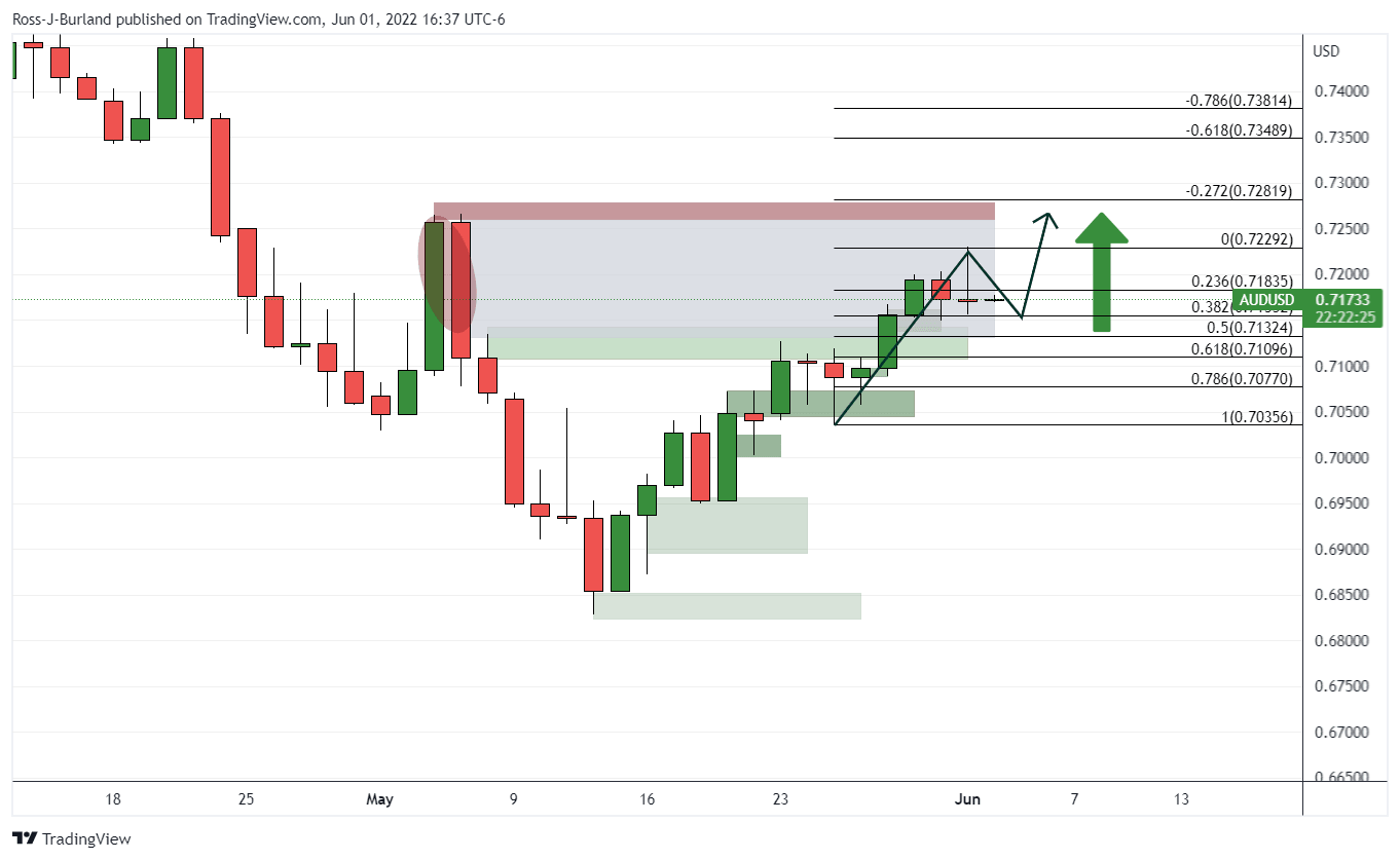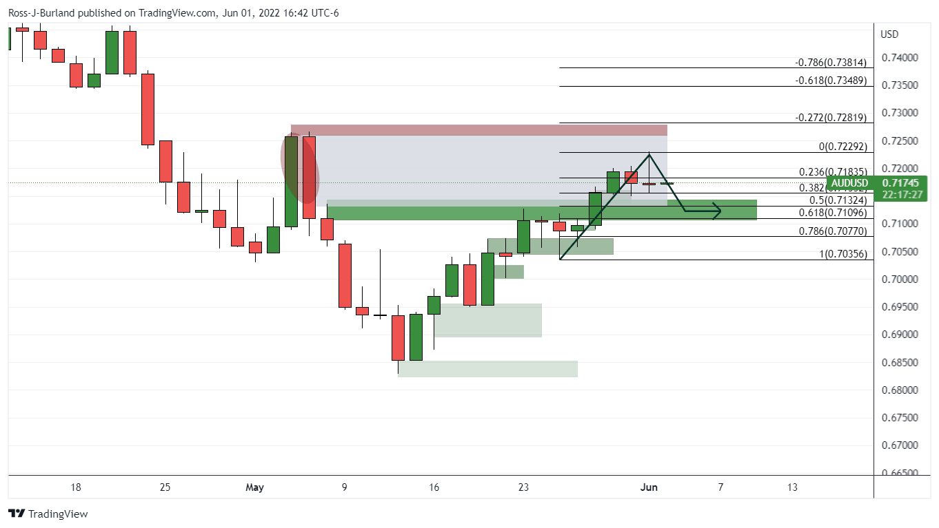 Wednesday's doji is not so bullish but the restest of the 38.2% could encourage buying as bulls move in at a discount and see to a full-on mitigation of the price imbalance between the highs of the doji to towards the My 5 highs of 0.7266. Failing that, if the bulls throw in the towel, a deeper correction to the support area below would be likely ahead of US Nonfarm Payrolls on Friday.