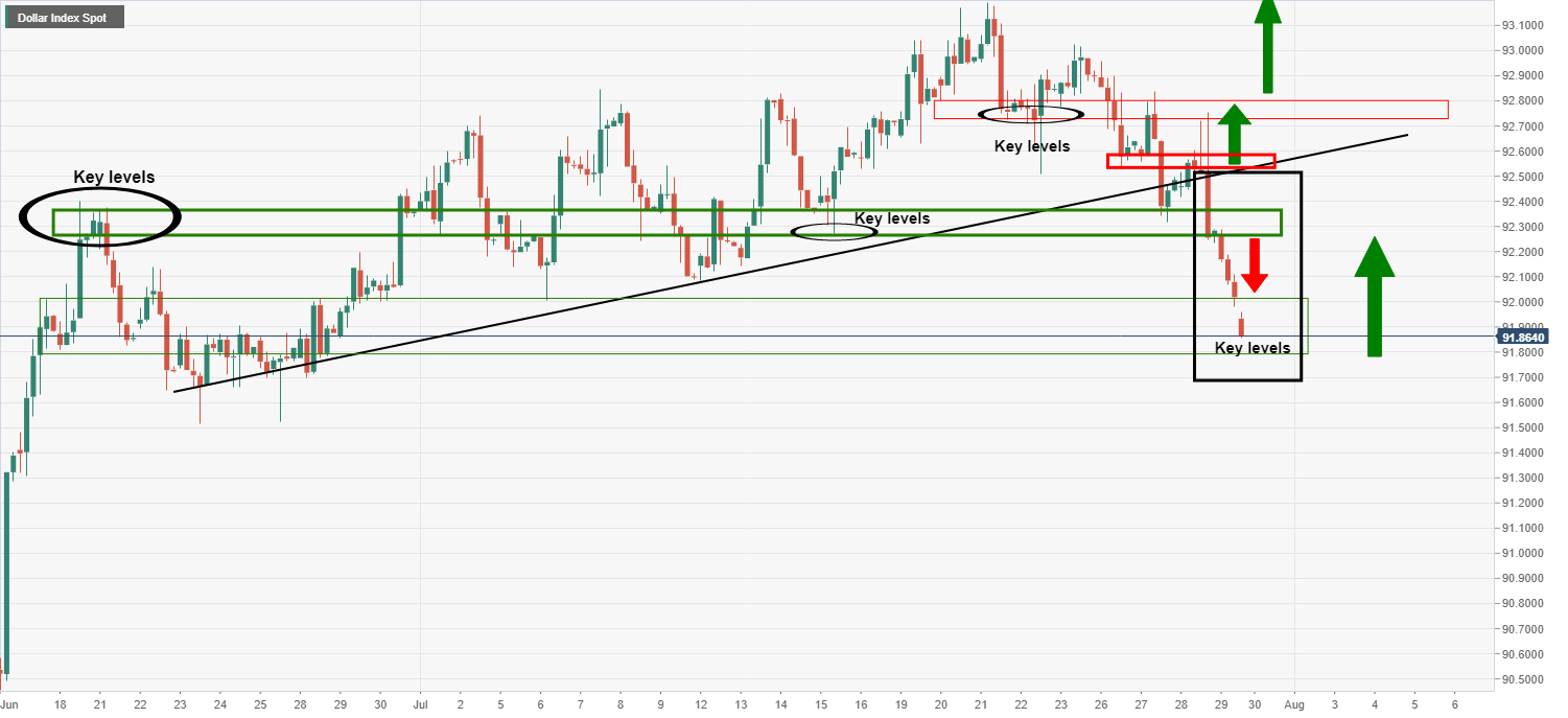Given it being month-end at a time where the market was net long US dollars leading into the meeting, squaring of postings in a buy the rumour sell the fact could arguably be the reason for the dollar's abrupt burst below dynamic support.