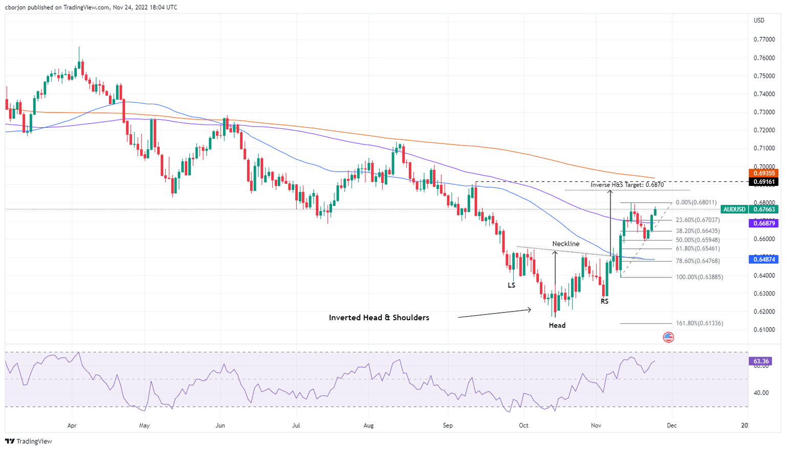 - AUD/USD is on its way to hitting the inverted head-and-shoulders target at 0.6870.