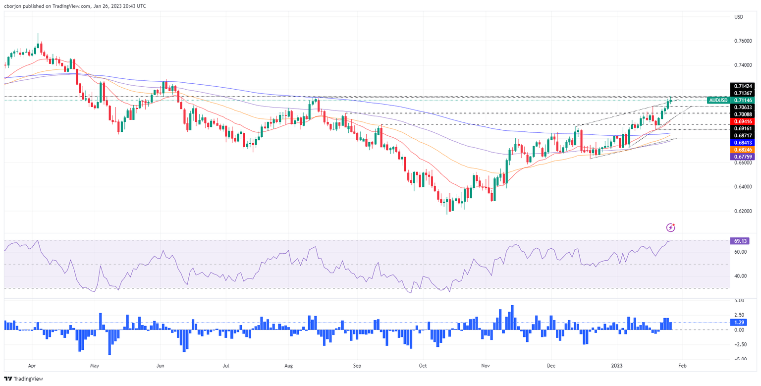 Therefore, the AUD/USD might continue its uptrend, albeit trimming some of its gains. Achieving a daily close above 0.7100 exacerbated an upward move towards a fresh 7-month high, keeping bulls hopeful of testing the 0.7200 mark. However, on its way north, the AUD/USD needs to clear 0.7142, followed by 0.7150, and then the 0.7200 psychological figure.