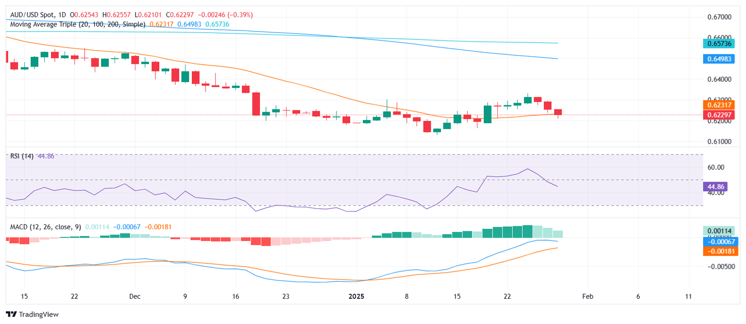 The AUD/USD remains under selling pressure, with the pair struggling to regain momentum. The Relative Strength Index (RSI) hovers in negative territory, reflecting bearish sentiment. Meanwhile, the MACD histogram prints rising green bars, suggesting some divergence. Key support lies at 0.6200, with a break below exposing 0.6170. On the upside, resistance is seen at 0.6230 (20-day Simple Moving Average).