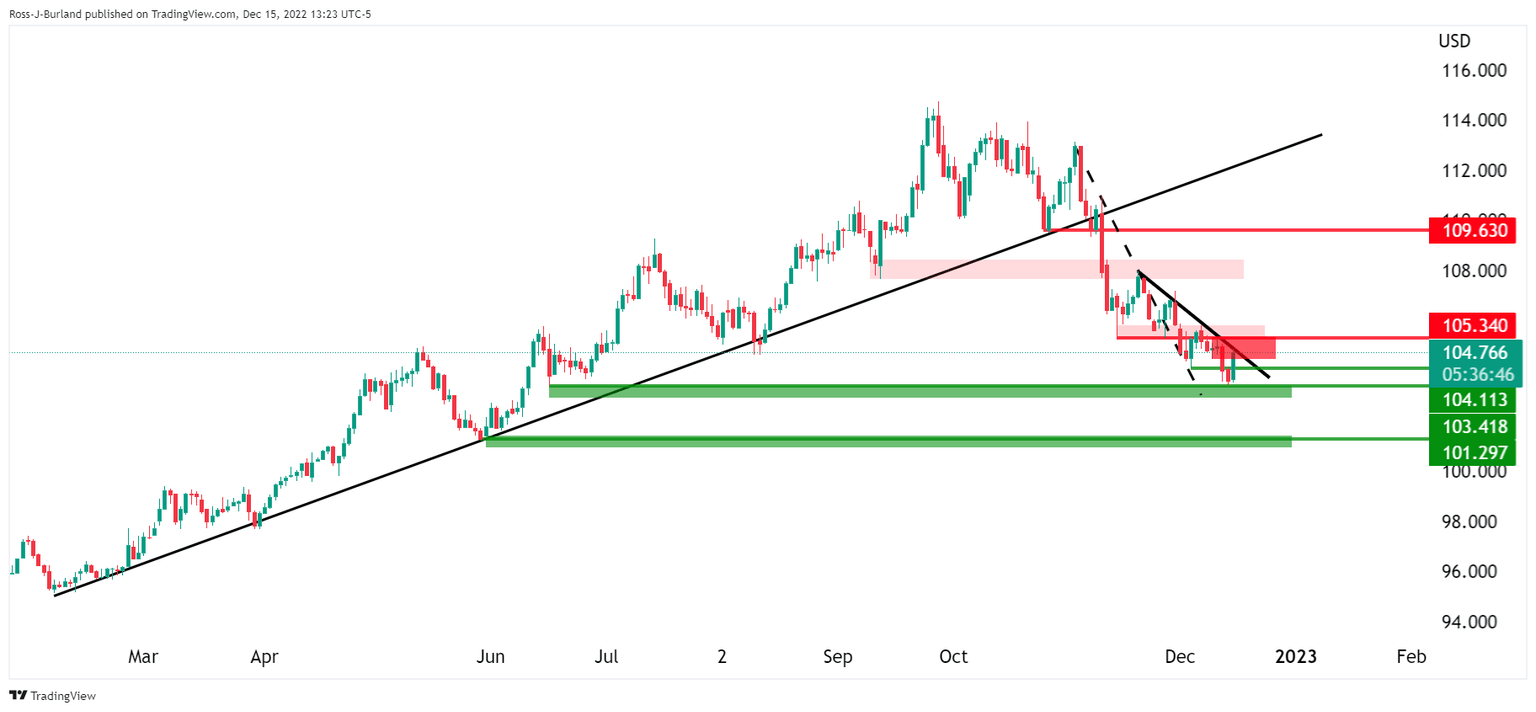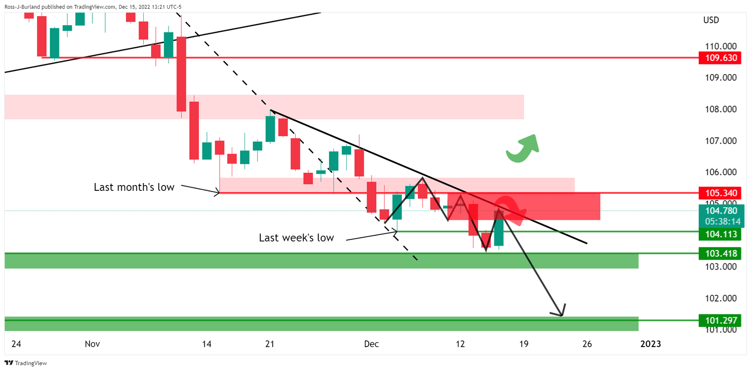 All in all, the US Dollar is getting traction as markets digest the central bank decisions and hawkish guidance, weighing on the commodity complex (an AUD proxy) and risk assets. DXY, an index that measures the US Dollar, is trading higher near the highs of the day, around 104.80 after two straight down days. However, there is a technically bearish bias in DXY while the index remains on the front side of the bear trend as follows: