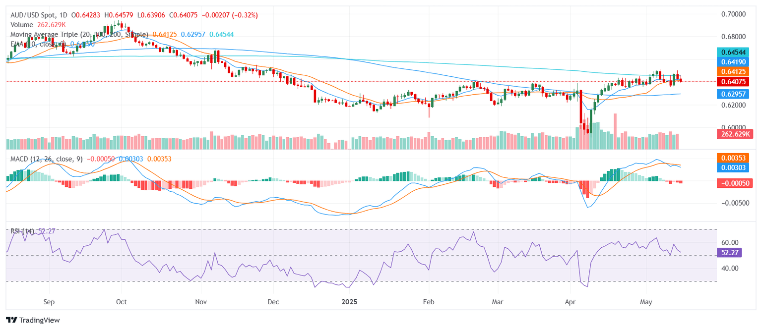The AUD/USD pair is trading near the 0.6400 zone, retreating from earlier highs as the US Dollar regains strength. This pullback follows a solid Australian labor market report, which showed a robust 89,000 jobs gain in April, significantly exceeding the 22,500 expected and marking a sharp recovery from the prior month. Despite this, the Australian Dollar struggled to maintain momentum as broader market sentiment turned cautious ahead of US economic data releases, including Retail Sales and Producer Price Index (PPI) figures.
