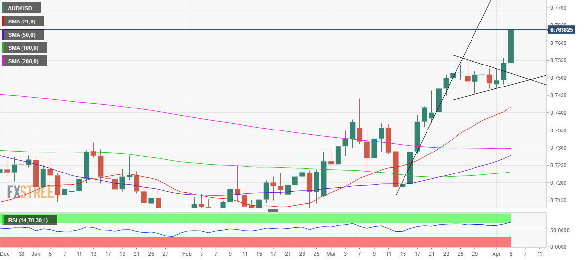 AUD bulls remain poised for the further upside towards 0.7700, although the 14-day Relative Strength Index (RSI) is peeping into the overbought region, warranting caution.