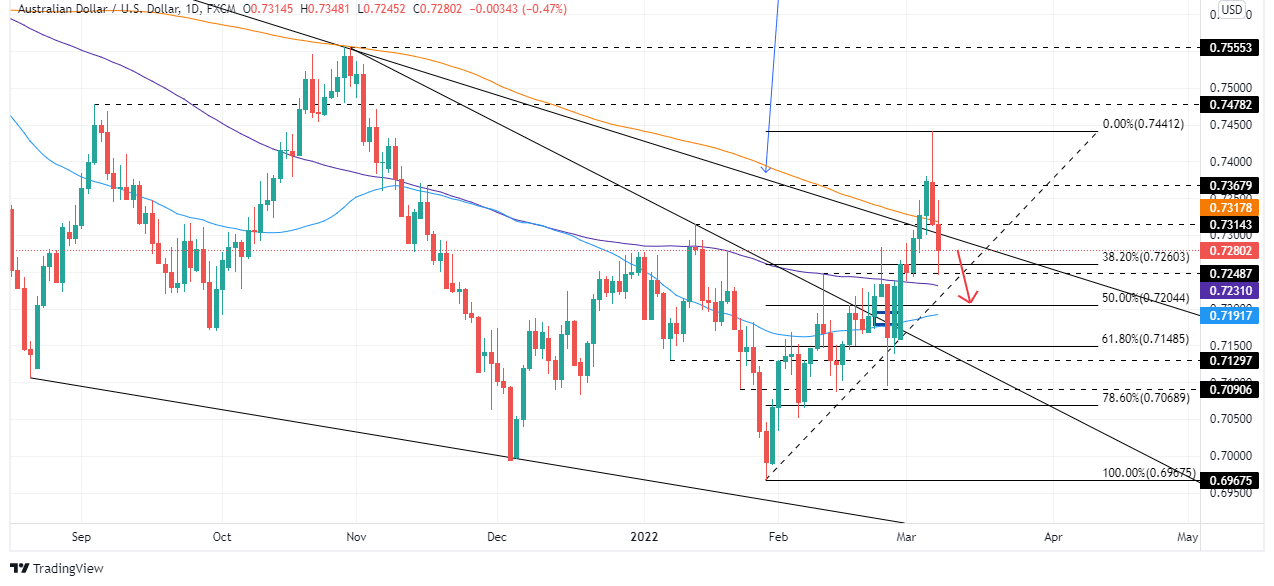 - AUD/USD Price Forecast: In the long-term neutral-upward biased but might print a leg down towards the 50% Fibo, confluence with the 0.7200 mark.