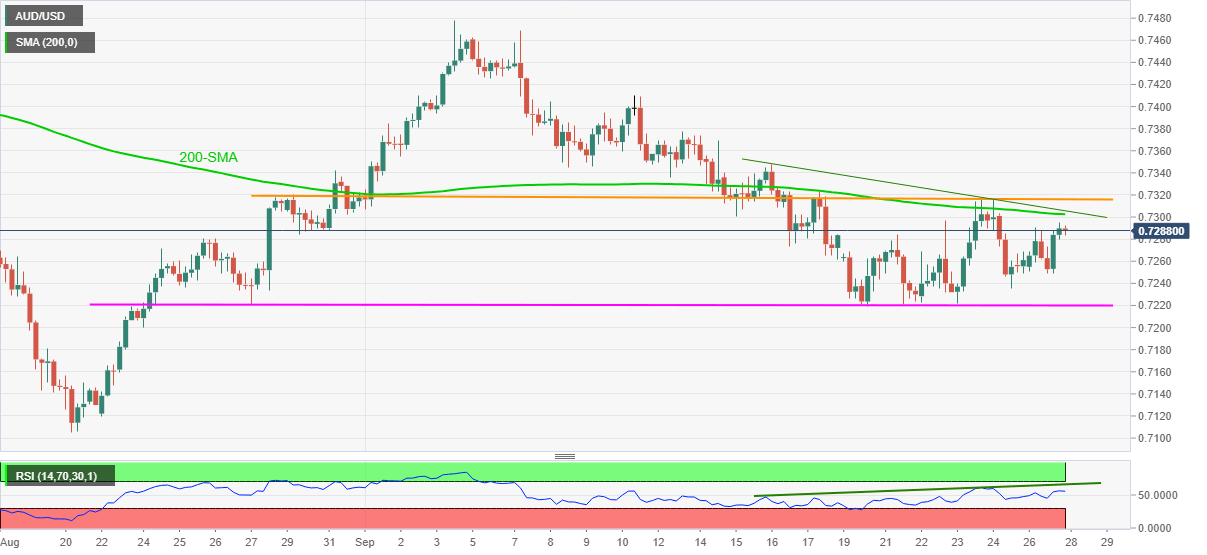 Bearish divergence and 200-DMA challenges the AUD/USD buyers inside the 100-pip range between 0.7320 and 0.7220.