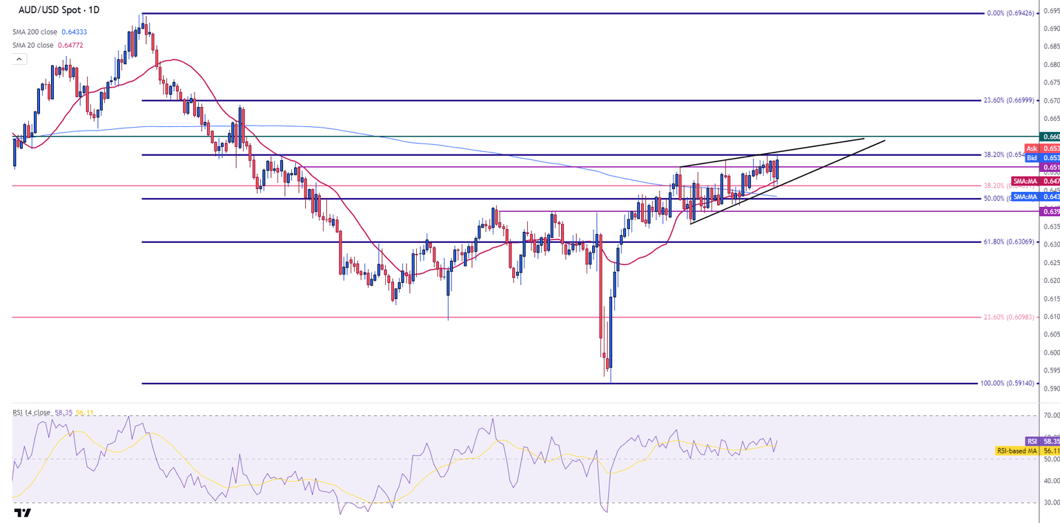 - AUD/USD breaks above 0.6500, as Fibonacci resistance firms at 0.6550.