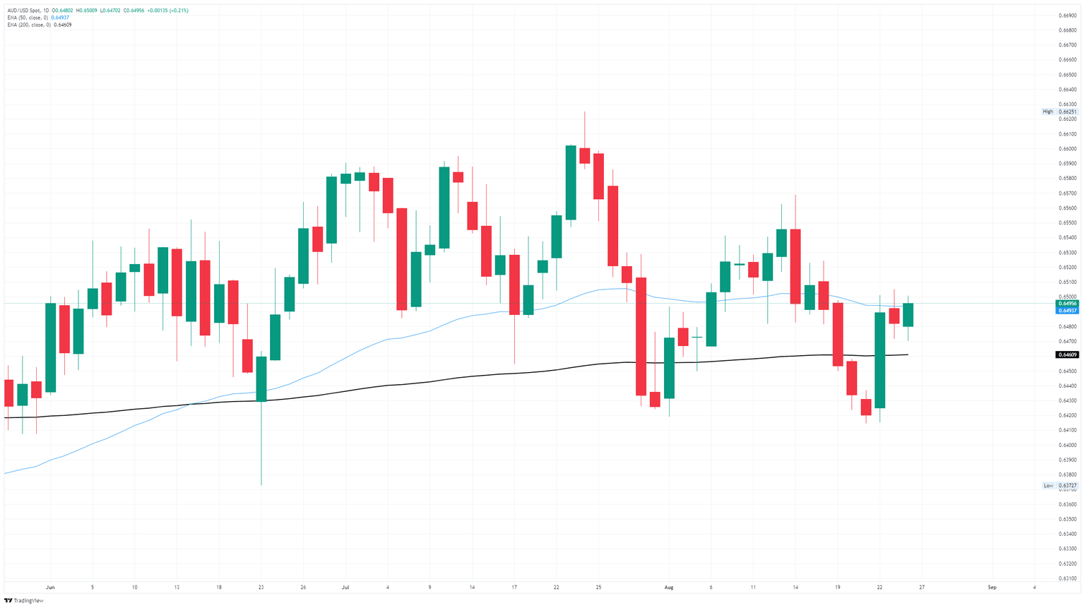 - The Aussie-Dollar pair remains trapped just above the 200-day EMA, but below 0.6500.