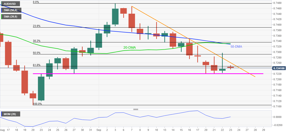 AUD/USD holds lower ground, keeping post-Fed losses close to 0.7240 amid Thursday’s Asian session. In doing so, the Aussie pair ignores firmer preliminary readings of September PMIs from the Commonwealth Bank of Australia (CBA). The reason could be a rethink over Fed’s tapering and rate hike plans.