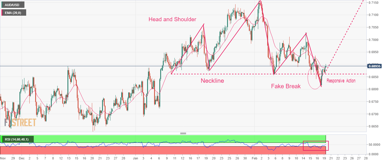 AUD/USD has negated the downside break of the Head and Shoulder chart pattern formed on a four-hour scale. The responsive buying active from the market participants has pushed the Aussie asset above the neckline of the aforementioned chart pattern plotted from January 10 low at 0.6860. The asset has scaled above the 20-period Exponential Moving Average (EMA) at 0.6888, which indicates that the short-term trend is bullish now.