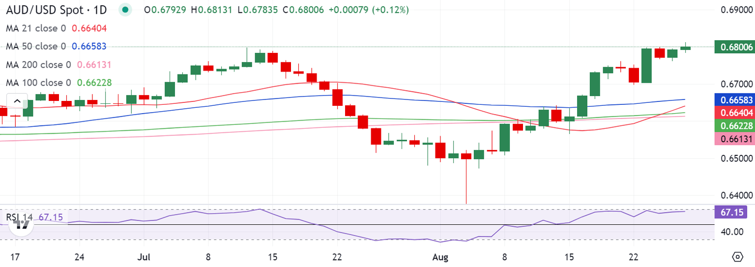 AUD/USD is paring back gains to trade near 0.6800 in Asian trading on Wednesday, having reversed a spike to a new seven-month high of 0.6813.
