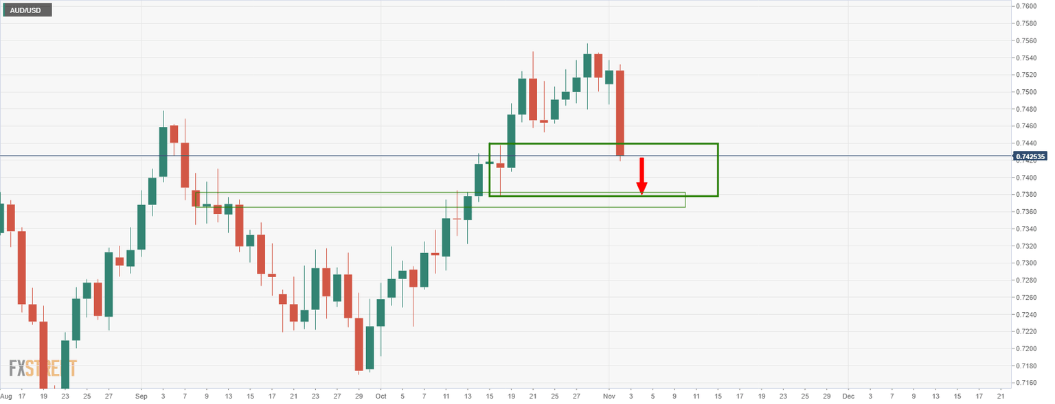 - AUD/USD bears have taken over, but there are bullish prospects from here.