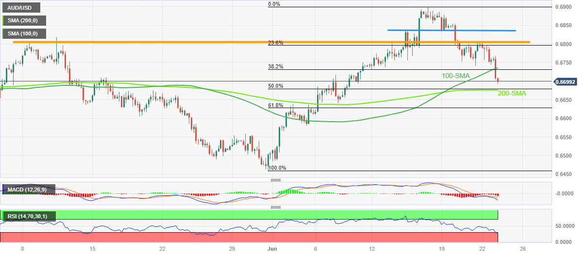 AUD/USD bears are in the driver’s seat at the lowest level in a fortnight, down 0.90% intraday around 0.6700 by the press time.
