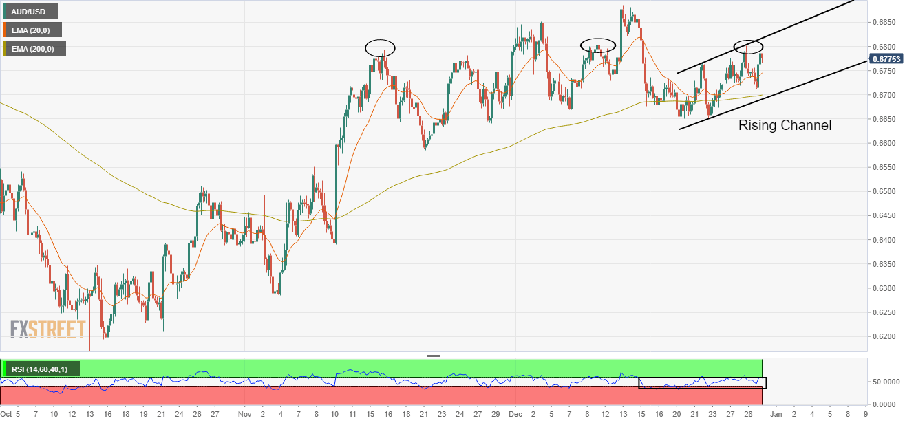 On a four-hour scale, the Aussie asset is auctioning in a Rising Channel chart pattern, which is highly neutral as it has formed after a sell-off move from December 13 high around 0.6900. The round-level resistance of 0.6800 has remained a critical barrier for the Australian Dollar for the past 15 trading sessions.